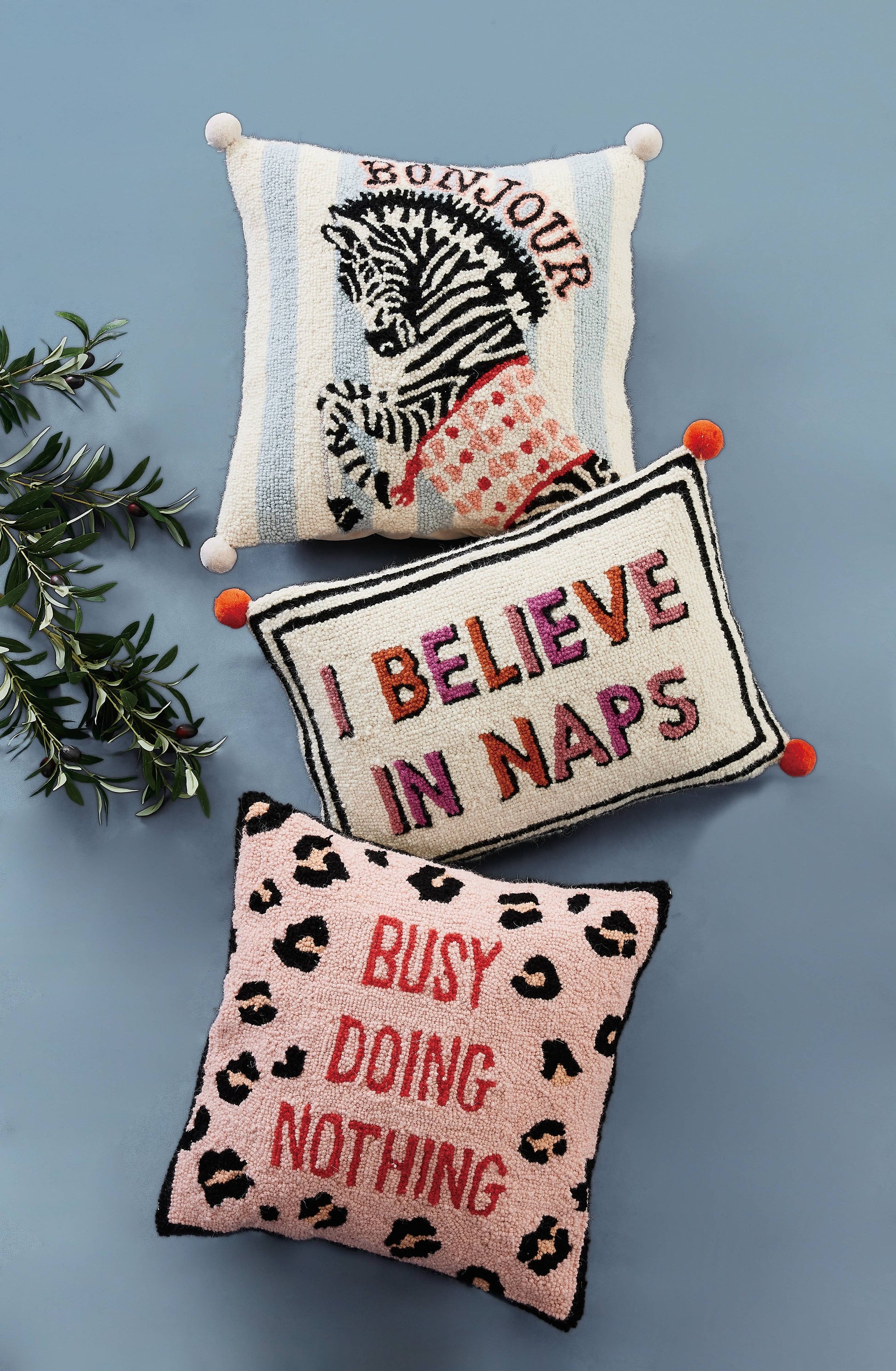 ★100% wool hooked accent pillow ★100% velvet backing ★Includes polyester insert, zipper closure ★14x20" lumbar throw pillow ★Designed by Yvonne Ellen
