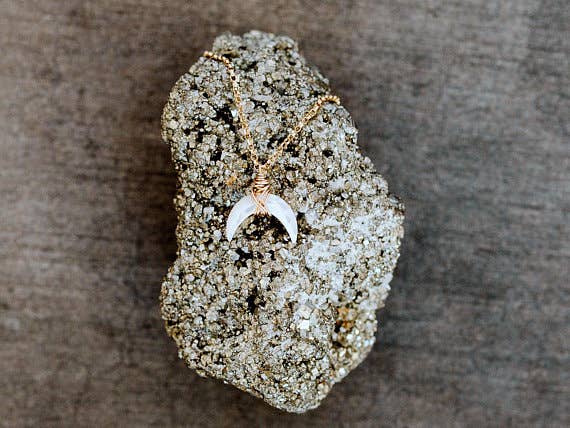 A gorgeous natural Mother of Pearl pendant, custom cut into a faceted crescent moon shape, is wrapped in my original style and suspended from delicate yet sturdy rolo chain creating a super adorable dainty necklace perfect for daily wear. Model is wearing the necklace in Mother of Pearl + 14k Gold Fill @ 18 inches long.