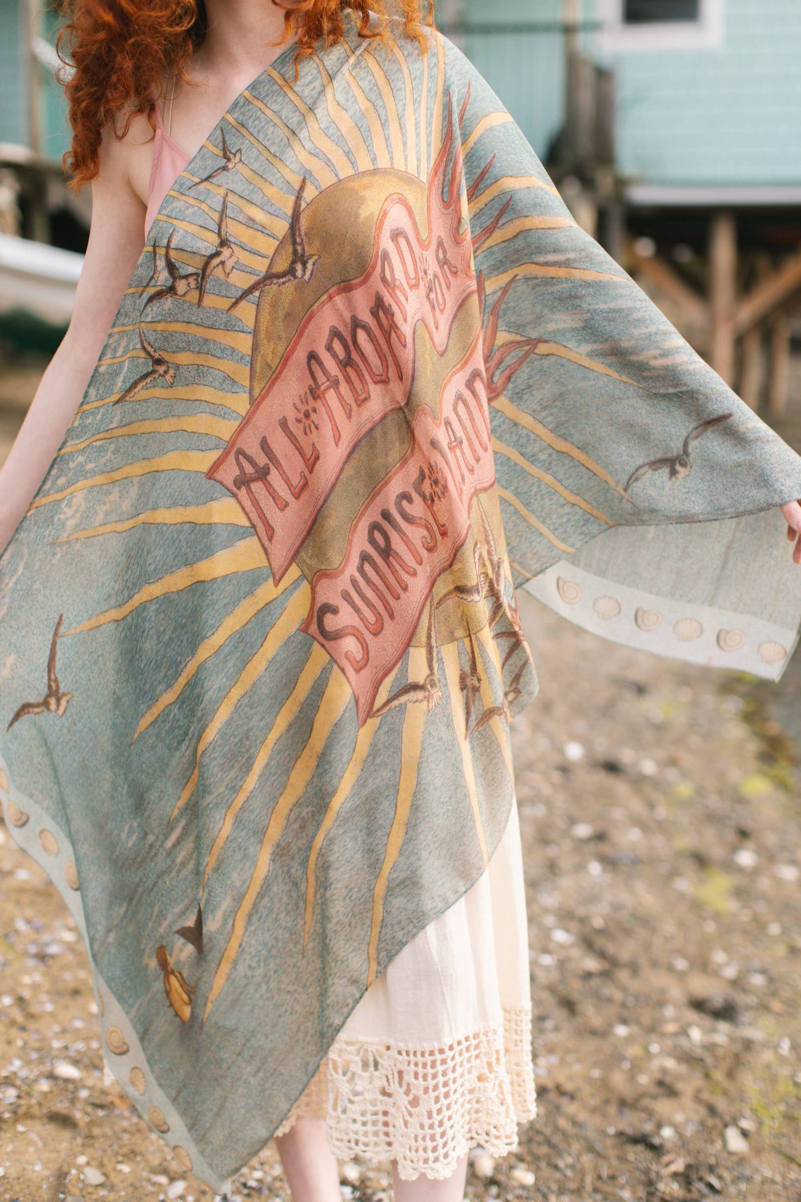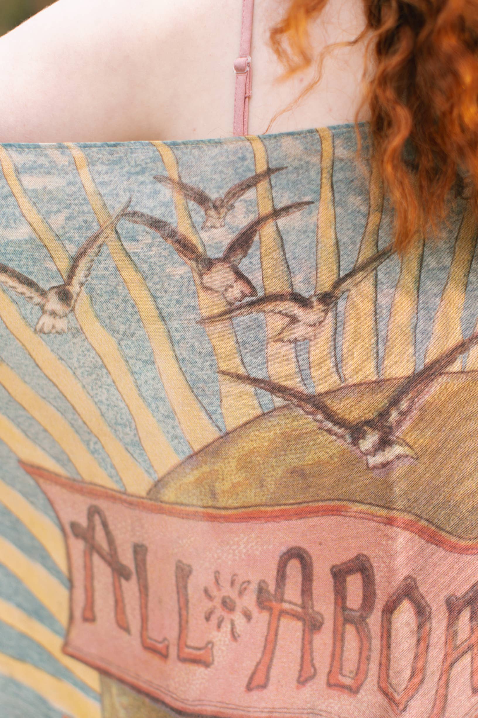 A lighthearted, joyous nod to adventure and sunny holiday travel, all aboard for Sunrise Lands! The nautical artwork comes from an 1880’s children’s travel book, and features a charming sailing ship, breezy banners, and a radiant sun. We trimmed the piece in hand drawn nautilus and scallop shells from a French 1800’s sketchbook. The lovely little mermaid comes from a 1905 print entitled “The Looking Glass of Venus” by Sir Edward Burne-Jones. We absolutely love the happy, beachy vibes!